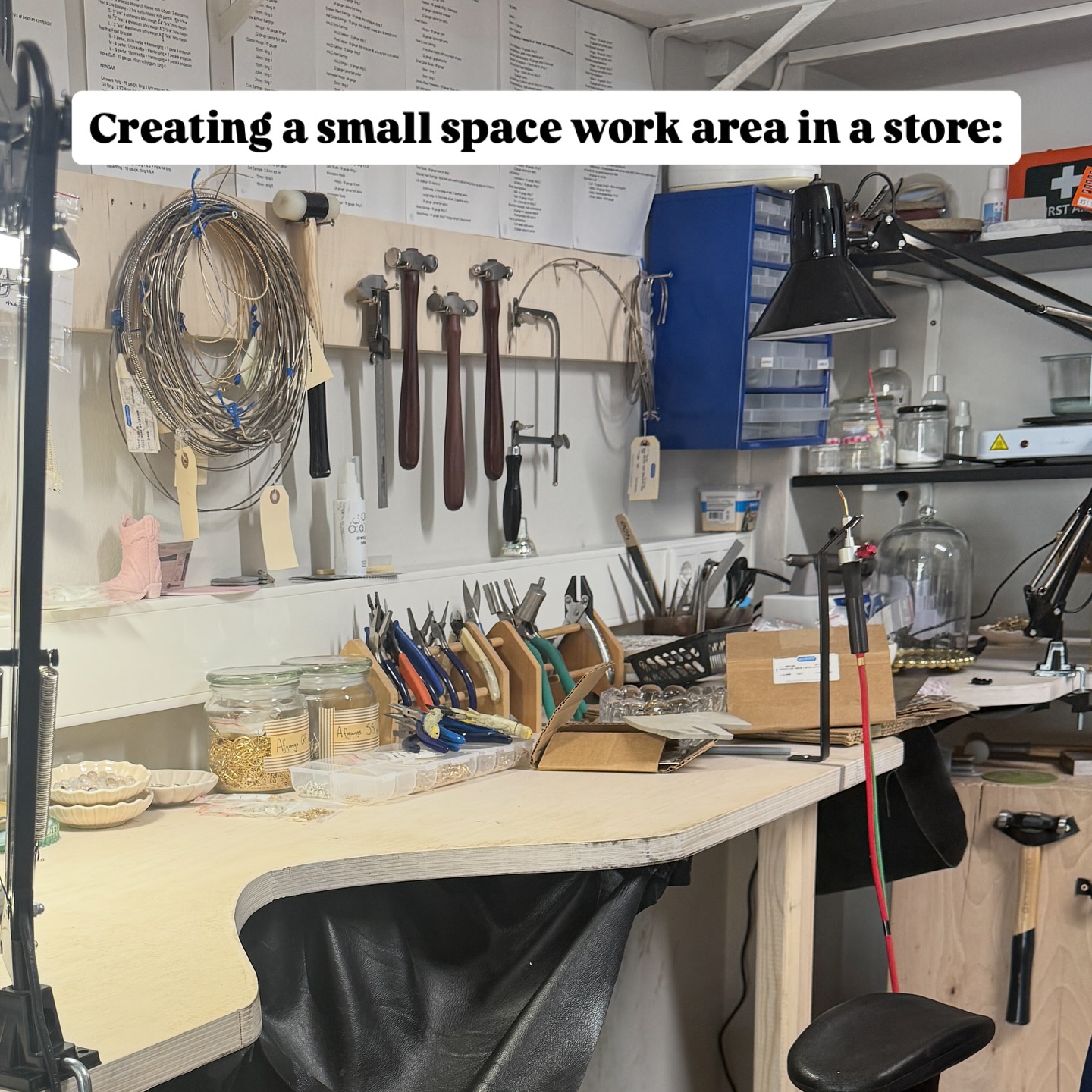 3️⃣ I also visited a collective @mjoll where four female goldsmiths share a storefront. They had a permanent jewelry setup right up front, and in the back they have a small bench which has a simple wood counter carved with traditional bench curve— they also utilize their space so well with storage on the walls.