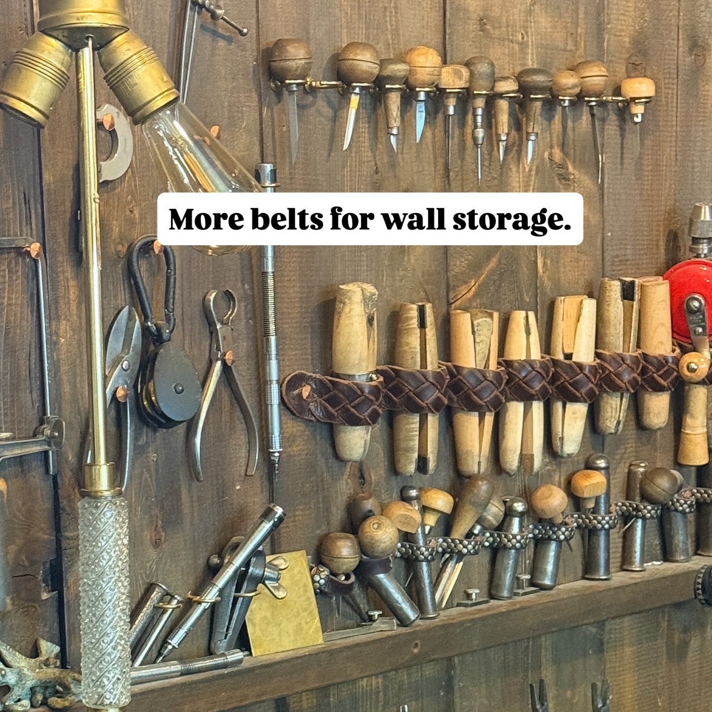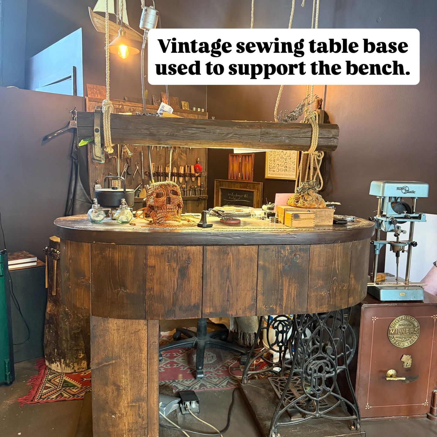 1️⃣ In the storefront and studio of @orrifinnjewels the jeweler has transformed old leather belts—to hold hammers around their stump and also wall organizers for hammers and tools. They even incorporated a vintage sewing table iron base into their custom bench build. Functional and beautiful.