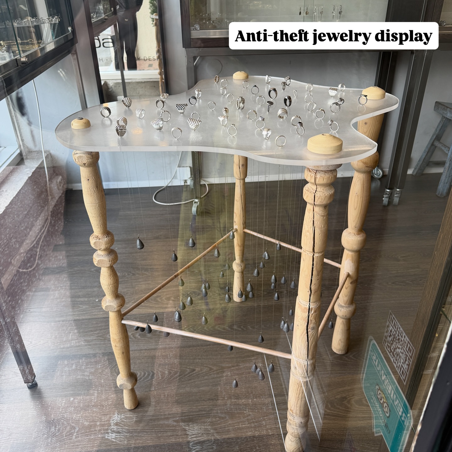 2️⃣ In another jewelry store, I noticed an anti-theft display system I’ve seen a few times at shows: you can pick up and try on a ring, but it’s attached to fishing wire with a weight at the bottom. The ring never fully leaves the case—simple, smart, and secure.